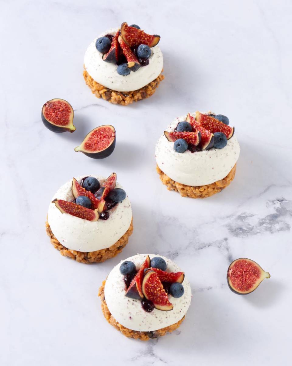 Croustillant pétales de maïs et noisettes, compotée figues et myrtilles, ganache montée vanille soupoudrée de chocolat myrtille et fruits frais.